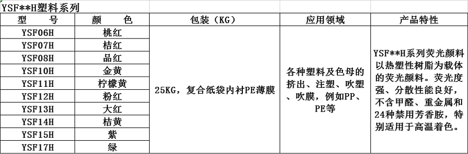 YSF**H系列荧光颜料以热塑性树脂为载体的荧光颜料。荧光度强、分散性能良好,不含甲醛、重金属和24种禁用芳香胺,特别适用于高温着色。