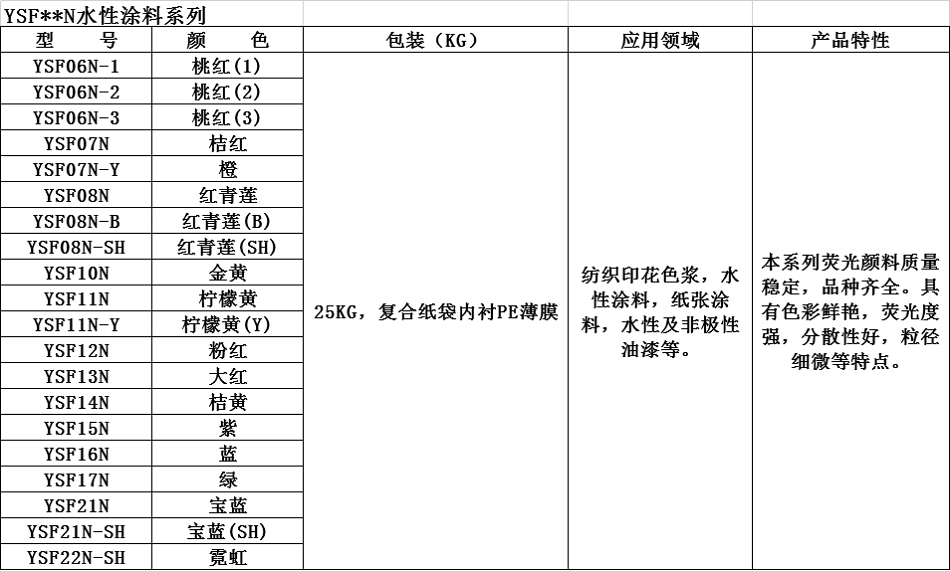 本系列荧光颜料质量稳定,品种齐全。具有色彩鲜艳,荧光度强,分散性好,粒径细微等特点。