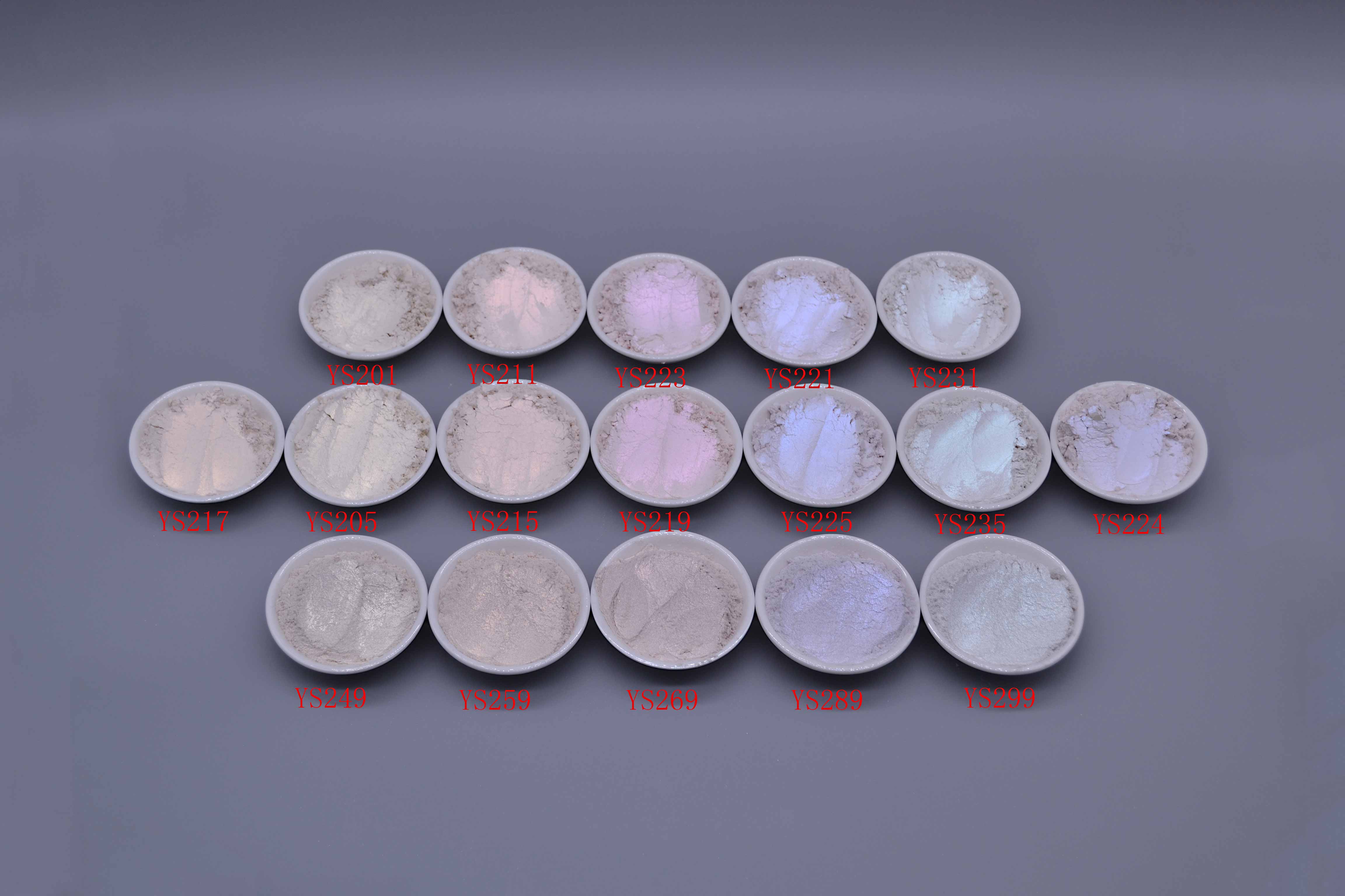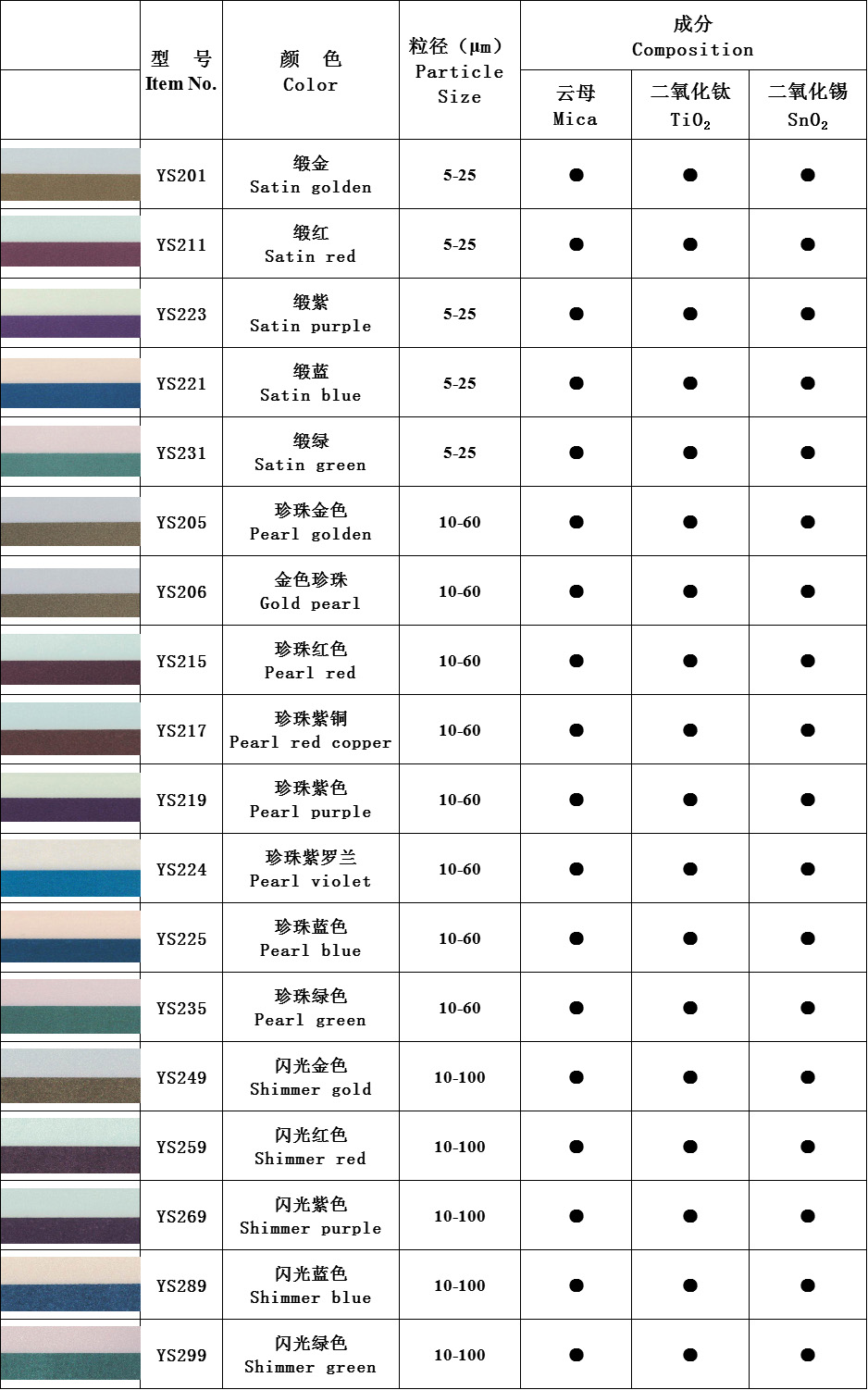 本系列产品以天然云母为基材,表面包覆一层厚度严格控制的高折射率的金属氧化物,通过光的反射、折射等光的干涉效应从而产生丰富的色光和色彩