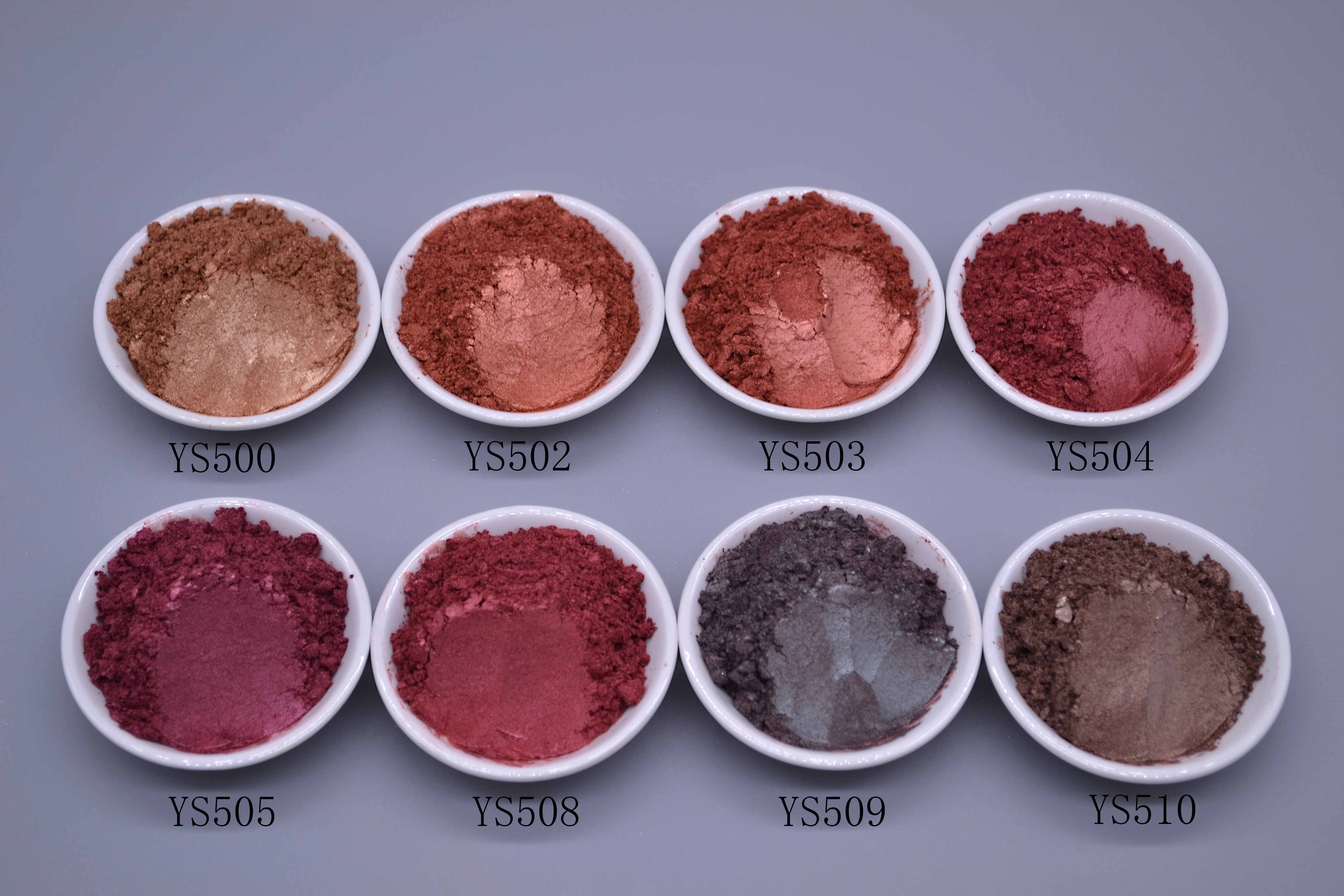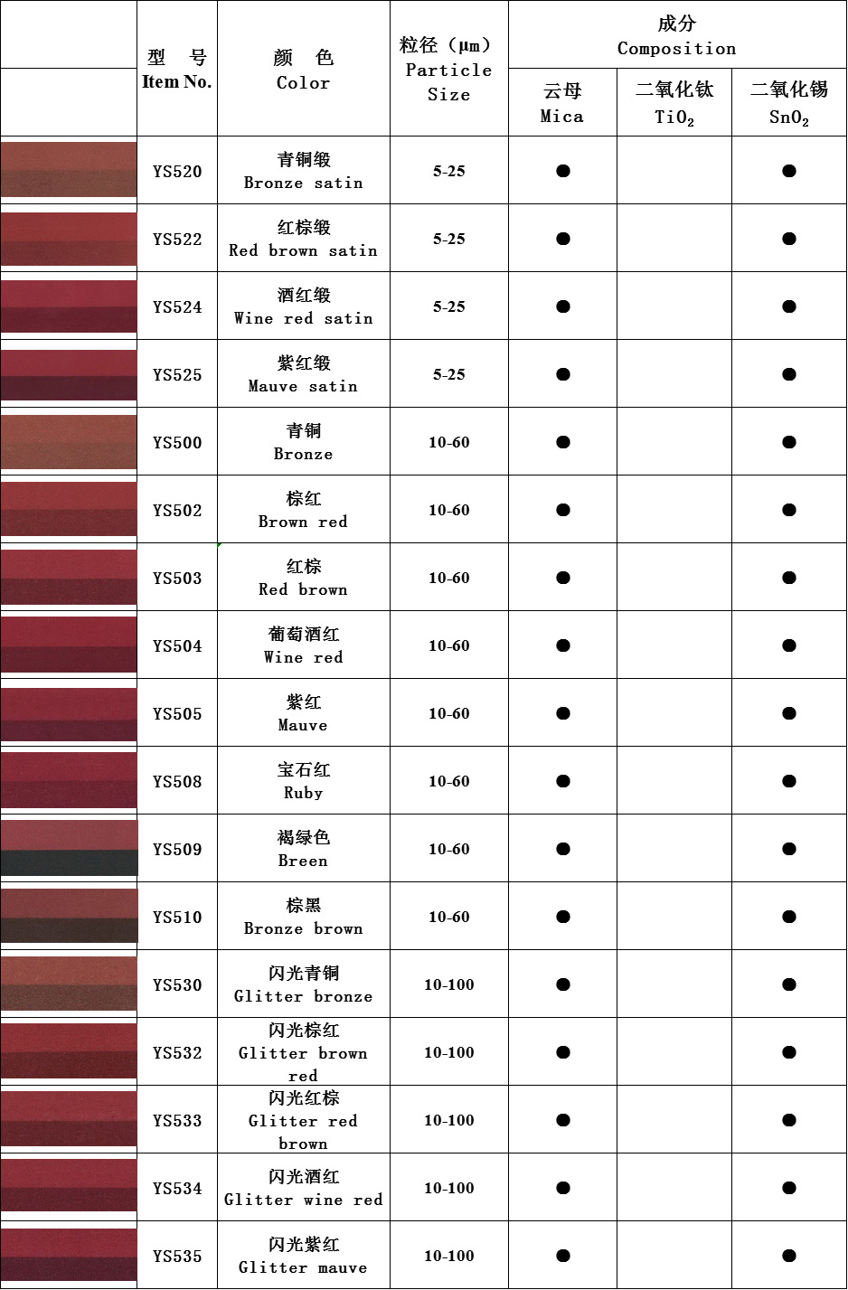 本系列产品以天然云母为基材,表面包覆一层厚度严格控制的高折射率的金属氧化物,通过光的反射、折射等光的干涉效应从而产生丰富的色光和色彩。