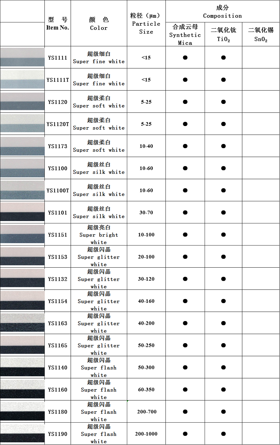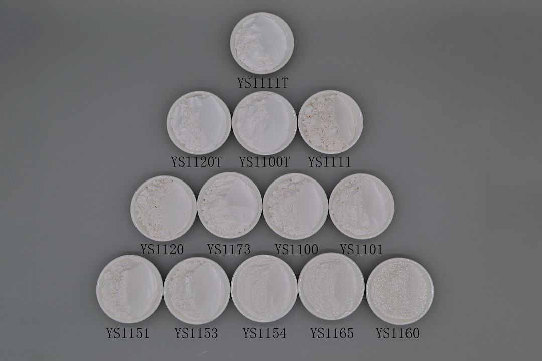 水晶珠光颜料系列:本系列产品以精选人工合成云母为基材,通过精准控制不同金属氧化物的包覆厚度从而产生闪烁夺目,璀璨亮丽的珠光效果。产品包括:水晶超白系列、水晶虹彩系列,水晶金色系列、水晶金属系列、水晶彩色系列、水晶高光系列等