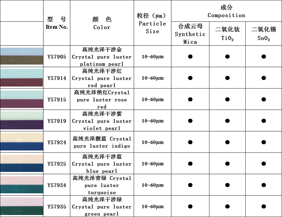 水晶珠光颜料系列:本系列产品以精选人工合成云母为基材,通过精准控制不同金属氧化物的包覆厚度从而产生闪烁夺目,璀璨亮丽的珠光效果。产品包括:水晶超白系列、水晶虹彩系列,水晶金色系列、水晶金属系列、水晶彩色系列、水晶高光系列等。