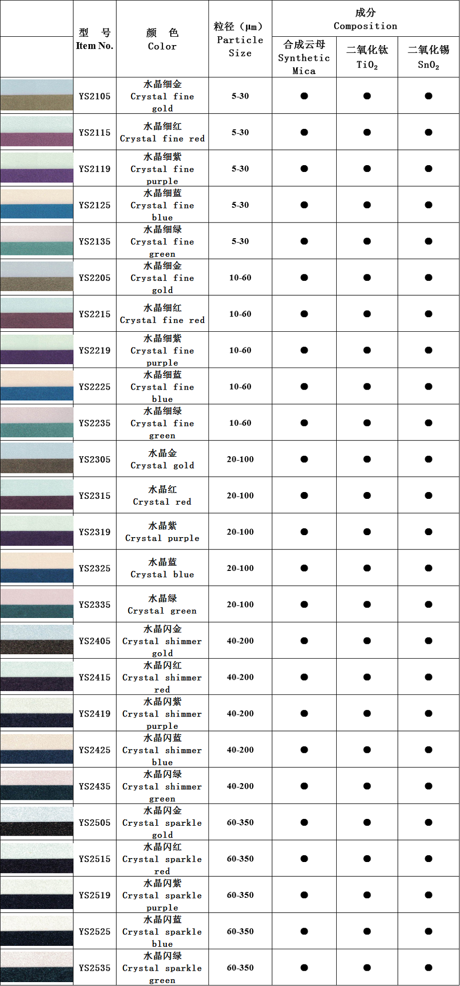 水晶珠光颜料系列:本系列产品以精选人工合成云母为基材,通过精准控制不同金属氧化物的包覆厚度从而产生闪烁夺目,璀璨亮丽的珠光效果。产品包括:水晶超白系列、水晶虹彩系列,水晶金色系列、水晶金属系列、水晶彩色系列、水晶高光系列等。