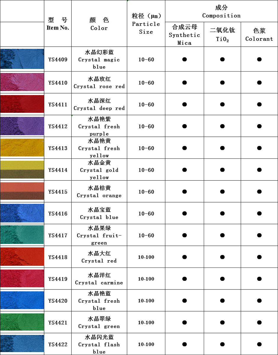 水晶珠光颜料系列:本系列产品以精选人工合成云母为基材,通过精准控制不同金属氧化物的包覆厚度从而产生闪烁夺目,璀璨亮丽的珠光效果。产品包括:水晶超白系列、水晶虹彩系列,水晶金色系列、水晶金属系列、水晶彩色系列、水晶高光系列等