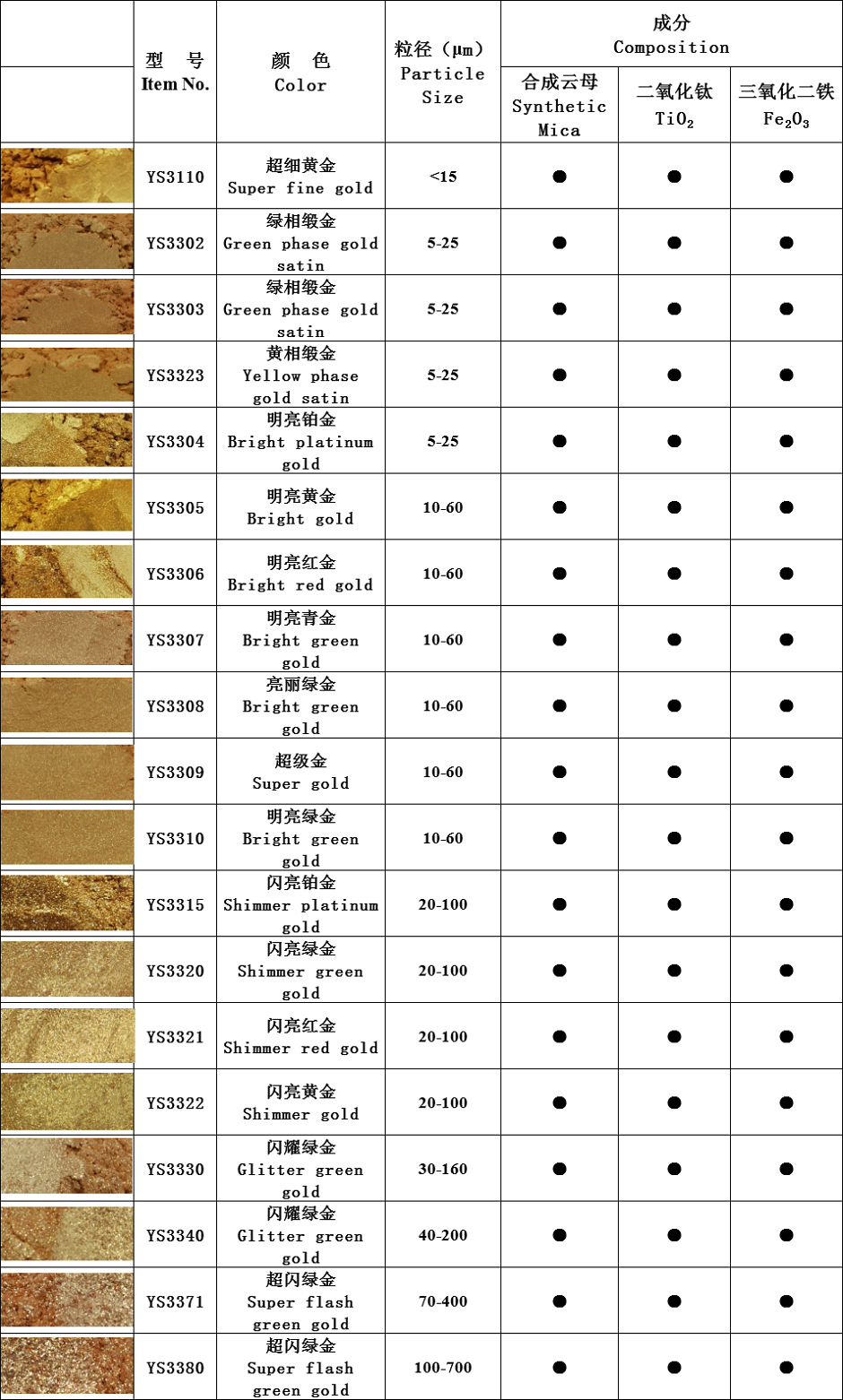 水晶珠光颜料系列:本系列产品以精选人工合成云母为基材,通过精准控制不同金属氧化物的包覆厚度从而产生闪烁夺目,璀璨亮丽的珠光效果。产品包括:水晶超白系列、水晶虹彩系列,水晶金色系列、水晶金属系列、水晶彩色系列、水晶高光系列等