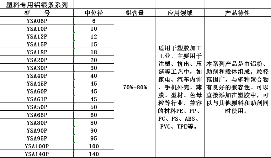 本系列产品是由铝粉、助剂和载体组成,粒径范围广,与多种聚合物有良好的兼容性。可以直接添加在塑胶中,可以与其他颜料和助剂同时使用。